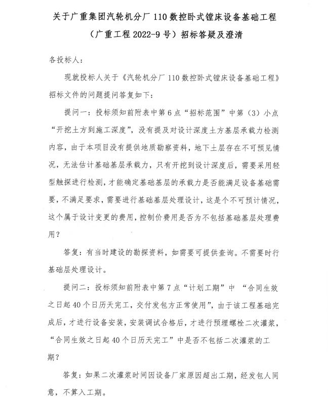 九游集团110数控卧式镗床(基础)工程项目招标答疑及澄清