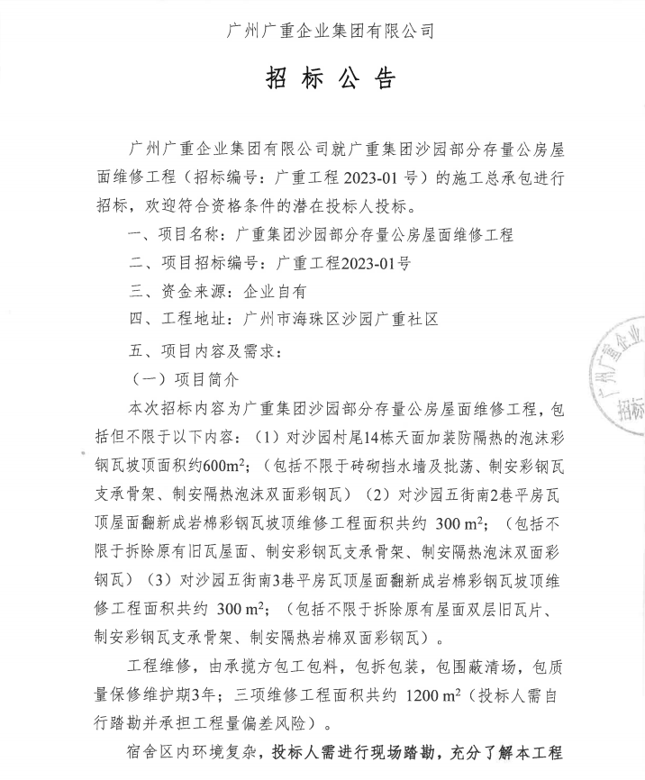 九游集团沙园部分存量公房屋面维修工程项目招标公告